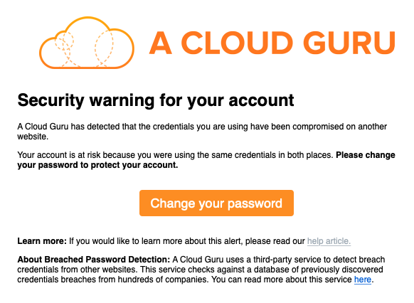 We love that you're taking your account's security seriously and checking your emails. We take security seriously as well, which is why we alert individuals whose accounts may be at risk. If you receive an email asking you to change your password, don’t panic. As long as the message is coming from an @teams.acloud.guru email address, it is a legitimate message for your protection.