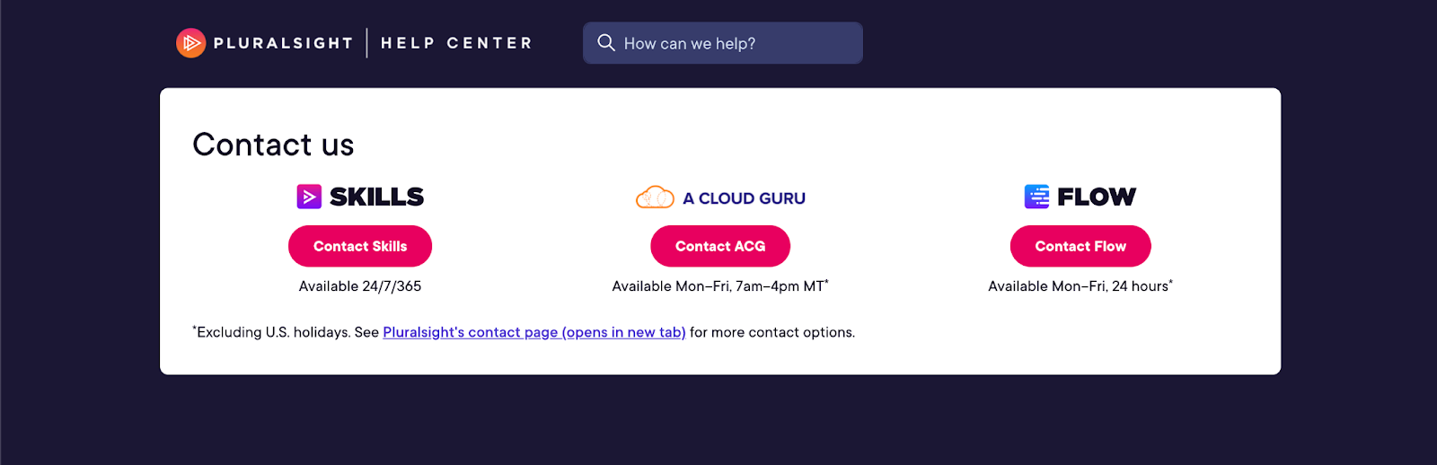 The Pluralsight Help Center has a new look and feel. Continue to use the search bar throughout the Help Center to explore articles and find answers to common questions.